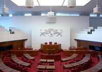 The hexagonal assembly room forms the center of the building. This is where the representatives sit, in a bright, friendly atmosphere. The Bremen colours of red and white underline the light architectural style, which is achieved by means of a skylight construction and windows behind the visitors' gallery. A stylised state coat of arms made of anodised light metal decorates the front wall.