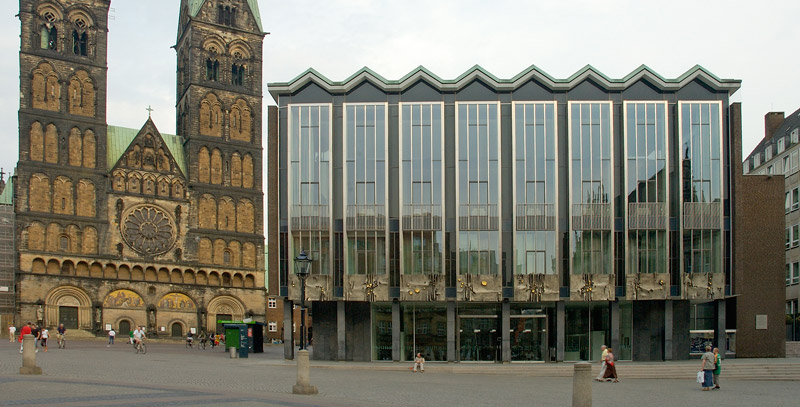 The new building on the east side of Bremen's Market Square was the subject of lively and controversial public debate for over a decade. Should an historical replica be built, or should the contemporary style of architecture dominate? In the end, it was the view of August Hagedorn, then the President, that prevailed. He had the courage to try something modern. A design - altered several times- by Wassilli Luckhardt, a Berlin- based architect of international standing, was realized. Luckhardt's designs and buildings were characterised by the style he helped to found: the "New Building" of the classical modern school of 1920s Germany.