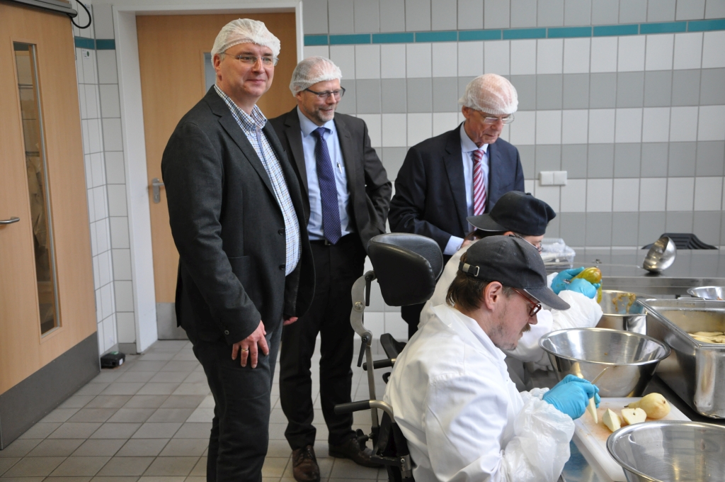 Geschäftsführer Ahlrich Weiberg konnte zusammen mit Dirk Dieling und Jutta Irmler von der Betriebsstätte Schiffbauer Weg immerhin einen Teil der Werkstatt Bremen präsentieren, der für 230 Menschen Beschäftigung bietet, davon 150 allein am Schiffbauer Weg. Großzügige Räume, die es auch Rollstuhlfahrern gut ermöglichen, am Produktionsprozess teilzunehmen, erinnerten nicht mehr wirklich an das ehemalige Casino der AG Weser.