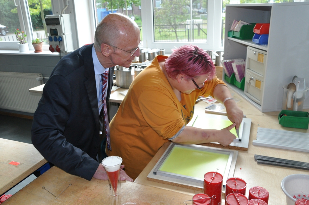 Jessica Radtkamp erklärt Präsident Weber genau und engagiert, wie die Kerzenproduktion geht.