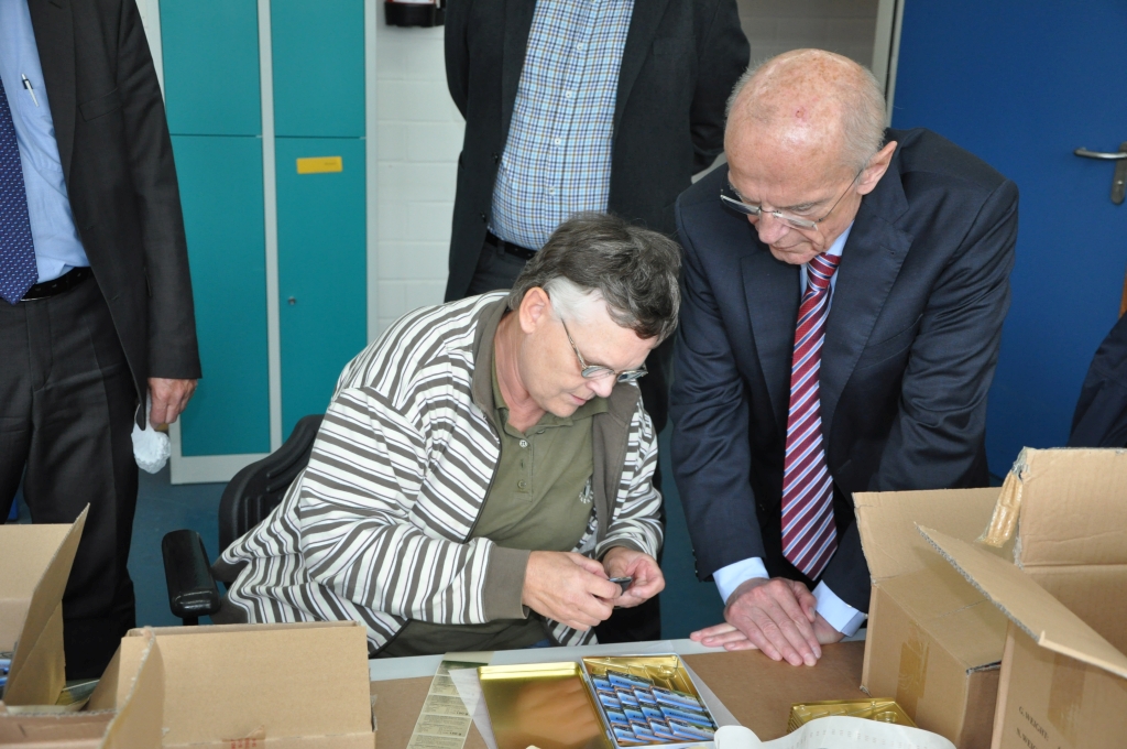 In der Kerzenabteilung war dann schon Weihnachten, zumindest in Form und Farbe der selbst hergestellten Kerzen. Großes Lob kam vom Präsidenten für Chefin Cornelia Nuhn, die die Arbeit so aufgeteilt hat, dass trotz jeder Form von Handicap ein unverzichtbarer Beitrag zum Gesamtwerk geleistet werden kann: „Und wenn jemand nur mit einer Hand arbeiten kann, dann suchen wir einen Produktionsschritt, der so zu leisten ist. Aber der Mitarbeitende weiß, dass sein Beitrag unverzichtbar ist für das Produkt.“ Richtig lecker wurde es dann in der Konfektionierung von Präsentverpackungen, wo gerade Schokolade verpackt wurde. Einen finanziell durchaus lukrativen Beitrag zur Solidargemeinschaft aller Beschäftigten leistet die Teeverpackung.