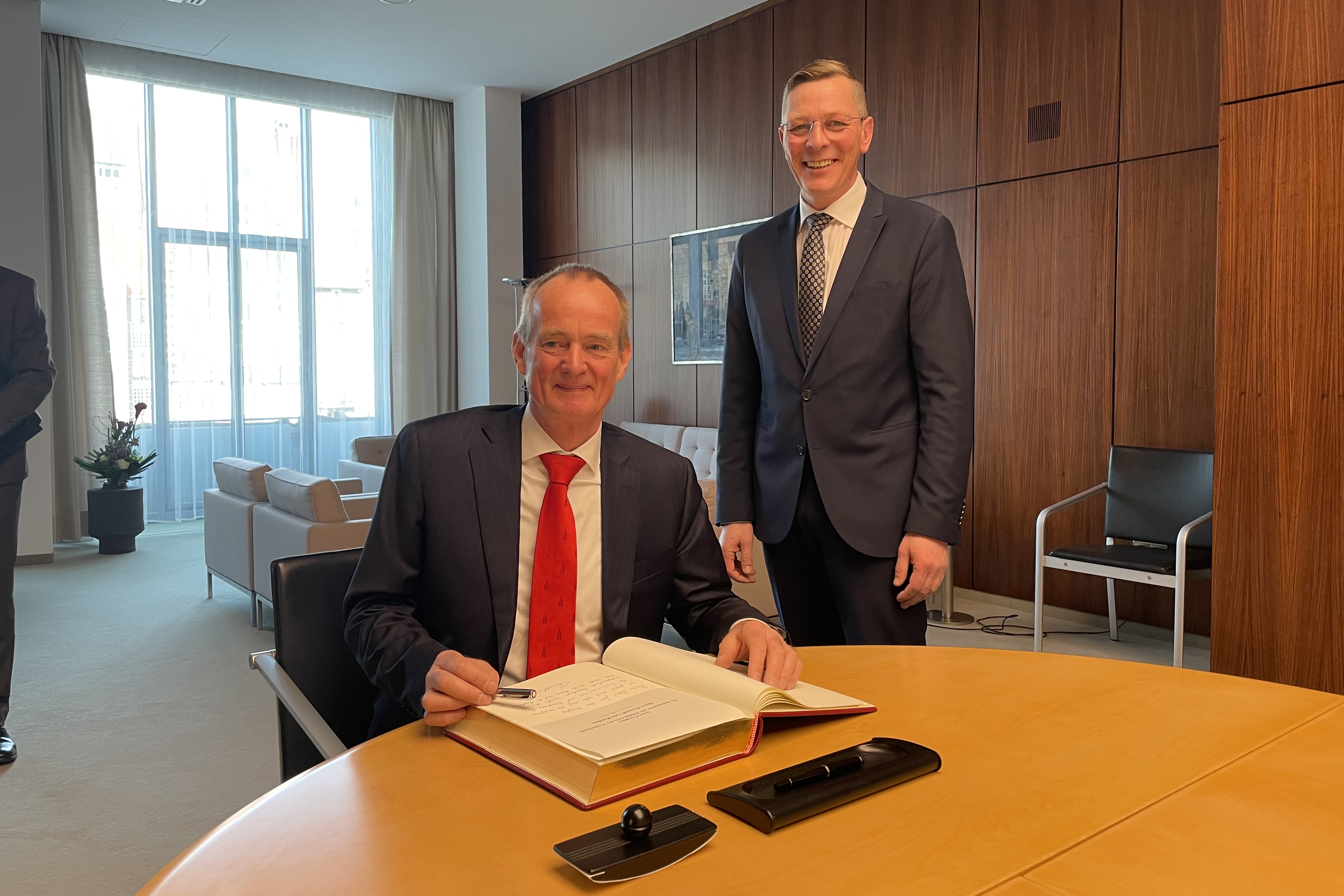 Bürgerschaftspräsident Frank Imhoff konnte heute den Botschafter des Königreichs der Niederlande, Ronald van Roeden, zum Antrittsbesuch im Parlamentsgebäude empfangen. Seit 2021 ist van Roeden Botschafter seines Heimatlandes in Berlin. Von 2017 bis 2021 war er bereits Botschafter und Stellvertretender Ständiger Vertreter bei der Europäischen Union in Brüssel.