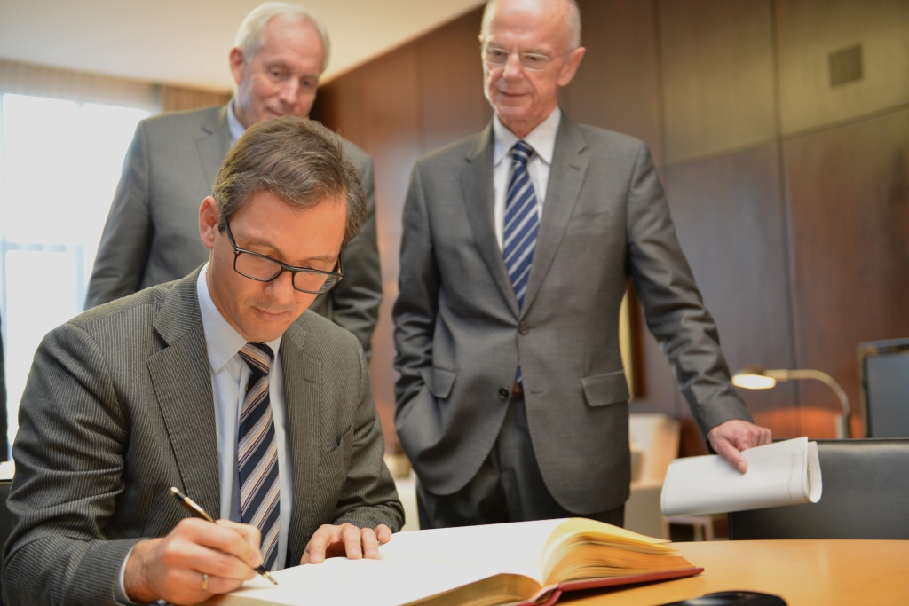 Richard Kühnel trägt sich im Beisein von Christian Weber (re.) und Christian Bruns (hi.) ins Gästebuch der Bürgerschaft ein