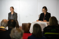 Zwei Schauspielerinnen sitzen im Festsaal uns lesen vor. Im Vordergrund sind Köpfe des Publikums zu erkennen.
