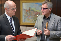 Die Bremische Bürgerschaft hat Hans-Joachim Steinbrück heute (22. Januar) in seiner Funktion als Landesbehindertenbeauftragten für weitere sechs Jahre bestätigt. Die Wiederwahl erfolgte einstimmig. „Das ist ein großartiger Vertrauensbeweis für einen Mann, der sich inzwischen bundesweit einen herausragenden Ruf erarbeitet hat“, betonte Bürgerschaftspräsident Christian Weber bei der Übergabe der Urkunde an den promovierten Juristen. Der 58-jährige Steinbrück bekleidet seit Mitte 2005 das Amt des Landesbehindertenbeauftragten. Zuletzt wirkte er maßgeblich am Aktionsplan des Senats zur Umsetzung der UN-Behindertenrechtskonvention im Land Bremen mit. Christian Weber: „Das ist ein sehr wichtiger Schritt zur vollständigen gesellschaftlichen Teilhabe von Menschen mit Beeinträchtigungen.“ Für die künftigen Aufgaben wird ein Landesteilhabebeirat eingerichtet und bei Steinbrück, dessen Dienststelle sich im Haus der Bürgerschaft befindet, angesiedelt. „Wir werden auch weiterhin alles tun, damit Sie die wachsenden Aufgaben umfassend und gut erledigen können“, versprach Christian Weber.
