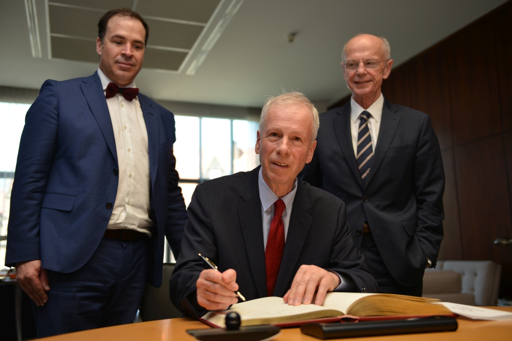 Abschließend gab es Gelegenheit zur Besichtigung des Plenarsaals, wo Dion und Weber gemeinsam am Präsidentenpult Platz nahmen. Der Besuch des Botschafters umfasste ebenfalls die Vorstellung in der Handelskammer und im Rathaus, wo er mit Bürgermeister Carsten Sieling und Wirtschaftssenator Martin Günthner zusammentraf.