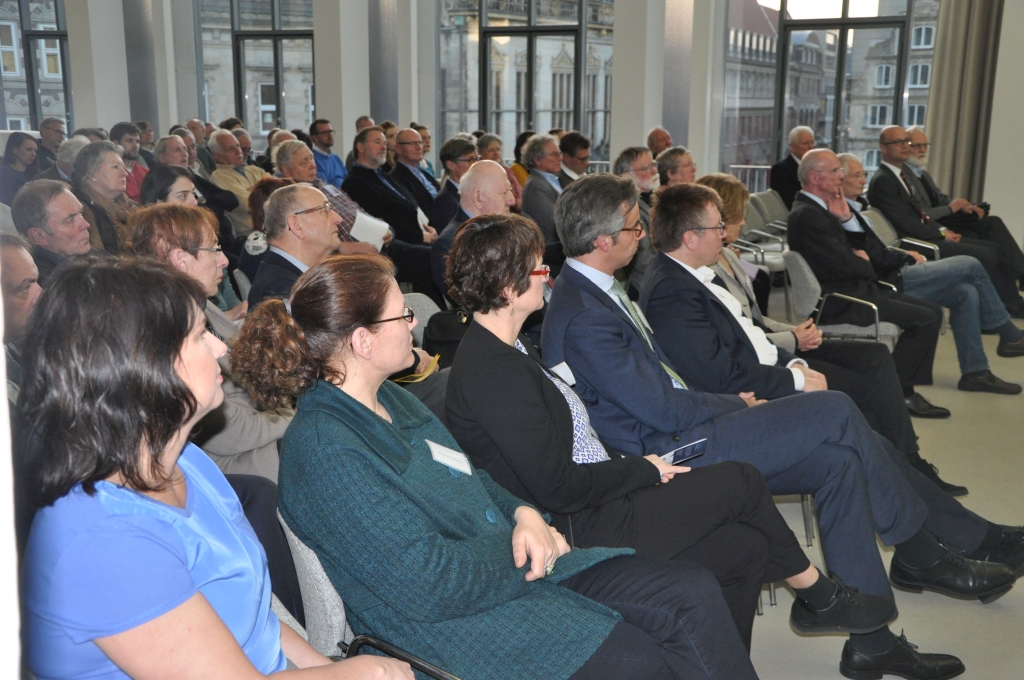 Der Festsaal war im Übrigen gut gefüllt mit Europa-Interessierten, trotz des warmen Vorfrühlingstages. „Und heute stehen zwar Experten zum Gespräch parat, aber im Mittelpunkt stehen die eingeladenen Bürgerinnen und Bürger, im Mittelpunkt steht der Dialog“, betonte Hermann Kuhn. Nach einer einführenden Talk-Runde ging es in die Sitzungsräume, um inhaltlich zu arbeiten. „Europas Rolle in der Welt“ wurde ebenso beleuchtet wie „(Frei)-Handel – Fluch oder Segen?“. Intensiv beteiligen konnten sich an diesen Diskussionen nicht nur die beiden Bremer Europa-Abgeordneten Dr. Helga Trüpel und Dr. Joachim Schuster und die Bremer Bevollmächtigte in Berlin und Brüssel, Staatsrätin Ulrike Hiller. Auch die Bürgerschaft war mit den Abgeordneten Dr. Henrike Müller, Antje Grotheer und Jens Eckhoff kompetent am Start.