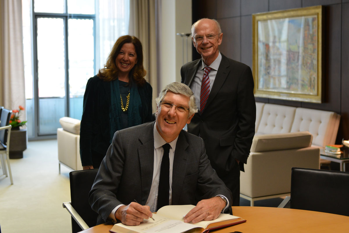 S. E. Joao Antonio da Costa Mira Gomes trägt sich in Anwesenheit von Generalkonsulin Luisa Pais Lowe und Präsident Christian Weber in das Gästebuch der Bremischen Bürgerschaft ein.