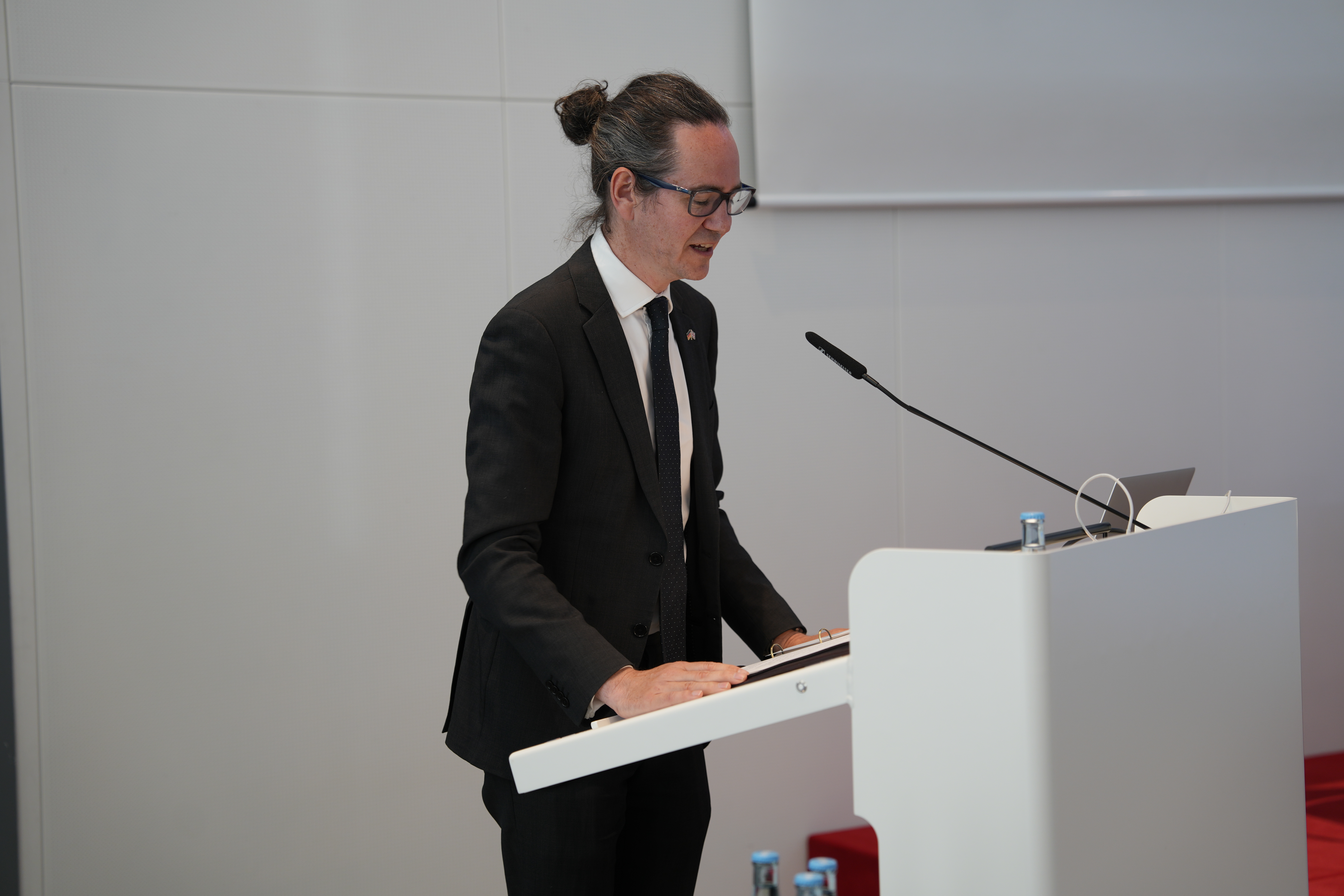 Kieran Drake, stellvertretender Botschafter des Vereinigten Königreichs Großbritannien und Nordirland, bezeichnete in seinem Grußwort den 8. Mai als ein Datum, das für Europa sowohl ein Ende als auch einen Neuanfang markiert habe, und stellte heraus, dass die schwierige Aussöhnung zwischen Großbritannien und Deutschland gelungen sei – nicht nur auf offizieller Ebene, sondern auch einfache Menschen seien in beiden Ländern aufeinander zugegangen. „Wir haben es heute in der Hand, auf unserer wertvollen Partnerschaft aufzubauen und für Dialog, Freiheit und Menschenrechte einzustehen. Dies schulden wir den Generationen, die nach uns kommen. Und dies schulden wir auch den zahlreichen Menschen, die vor 80 Jahren und in den Kriegsjahren davor ums Leben kamen“, betonte Drake.