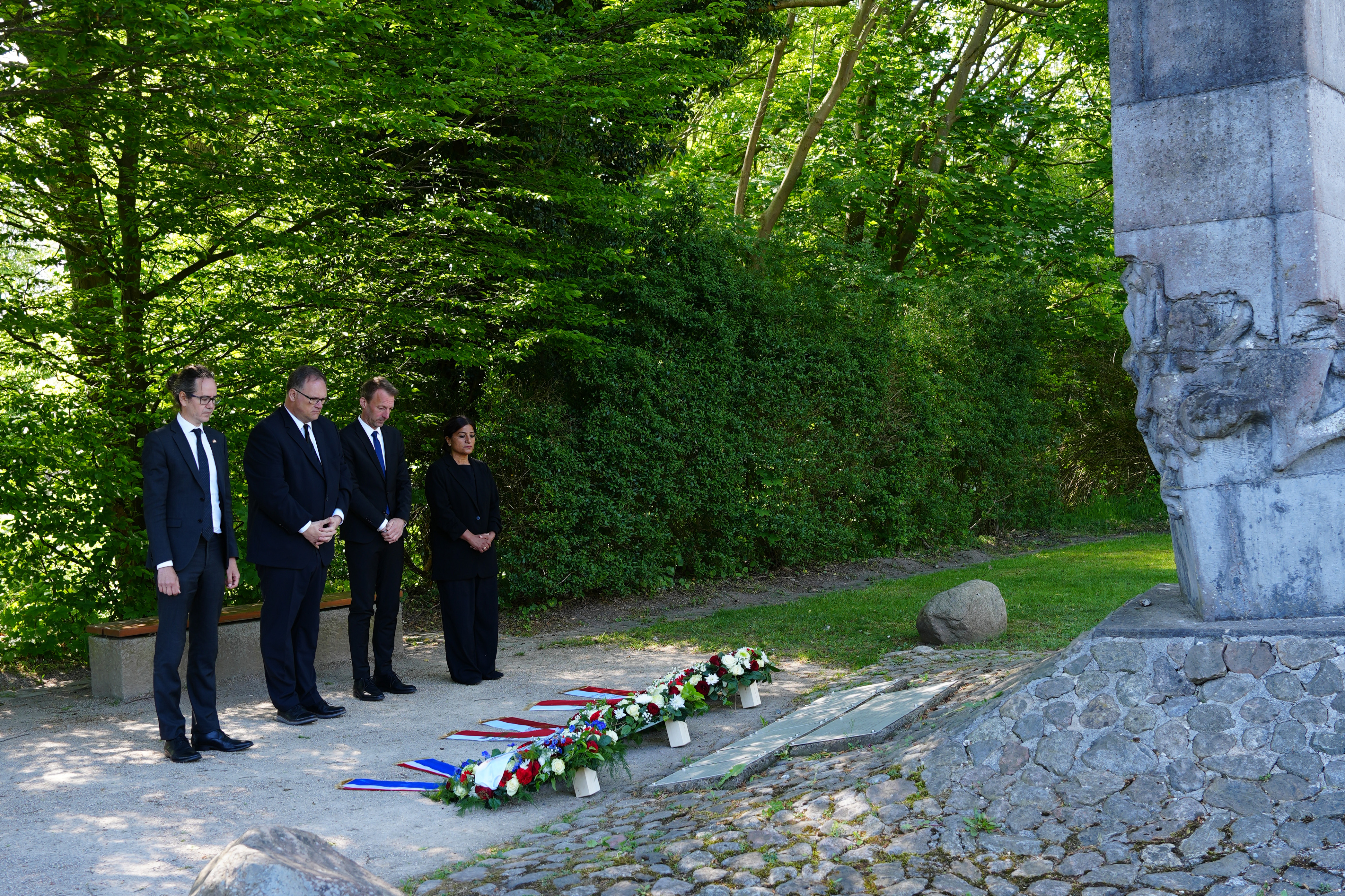 Kieran Drake, Bürgermeister Björn Fecker, Dr. Thomas Köcher und Vizepräsidentin Sahhanim Görgü-Philipp am Vormittag bei der Kranzniederlegung am Gedenkort Bunker Valentin