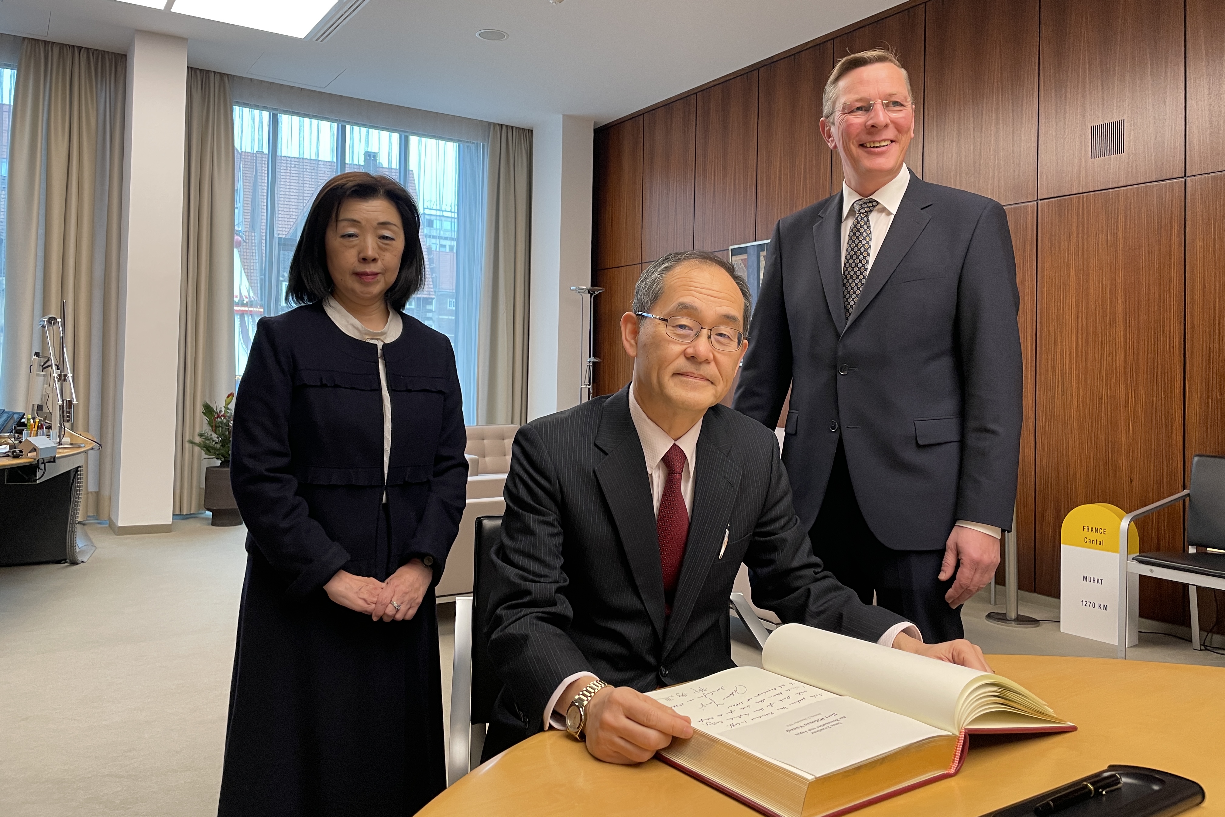 Japans Botschafter Hidenao Yanagi trägt sich ins Gästebuch ein. Links: Generalkonsulin Kikuko Kato, rechts: Präsidetn Frank Imhoff.