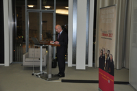 Bürgerschaftspräsident Weber überließ den Blick in das frühe Bremen und den mitteleuropäischen Westen Prof. van Lieburg und Prof. Hans Kloft, der als stellvertretender Präsident der Wittheit die Gäste begrüßte. Ganz im heute nahm Christian Weber Martin Luther, um konkret und aktuell zu werden: „Luther sagte damals, als er die Bibel ins Deutsche übersetzte: Man muss dem Volk aufs Maul schauen und zuhören, was das gemeine Volk sagt. Dieser Rat scheint mir heute gerade auch für uns Politiker aktuell wie nie zu sein. Er bedeutet für mich: auf die Menschen achten und auf sie zugehen, mit ihnen, nicht nur über sie reden, sie in ihren Alltagszusammenhängen abholen. Luther formulierte in seinem berühmten Feste-Burg-Choral „Und wenn die Welt voll Teufel wär und wollt uns gar verschlingen, so fürchten wir uns nicht so sehr, es soll uns doch gelingen.“ Wir leben in einer Welt, die es uns immer schwerer macht, unsere Werte zu bewahren oder sie überhaupt wieder zu finden; wir leben in einer Welt, die Angst macht – konkrete und diffuse Angst. Wir Politiker müssen uns nachhaltiger um Menschen kümmern, über die Breite der Gesellschaft, nicht nur um die eigene Klientel oder noch weniger, wie Amerika gezeigt hat: um die Macht des Kapitals. Es geht darum, suchenden und besorgten Menschen mit Empathie, Wärme und Wahrhaftigkeit zu begegnen. Es geht um Vertrauen.