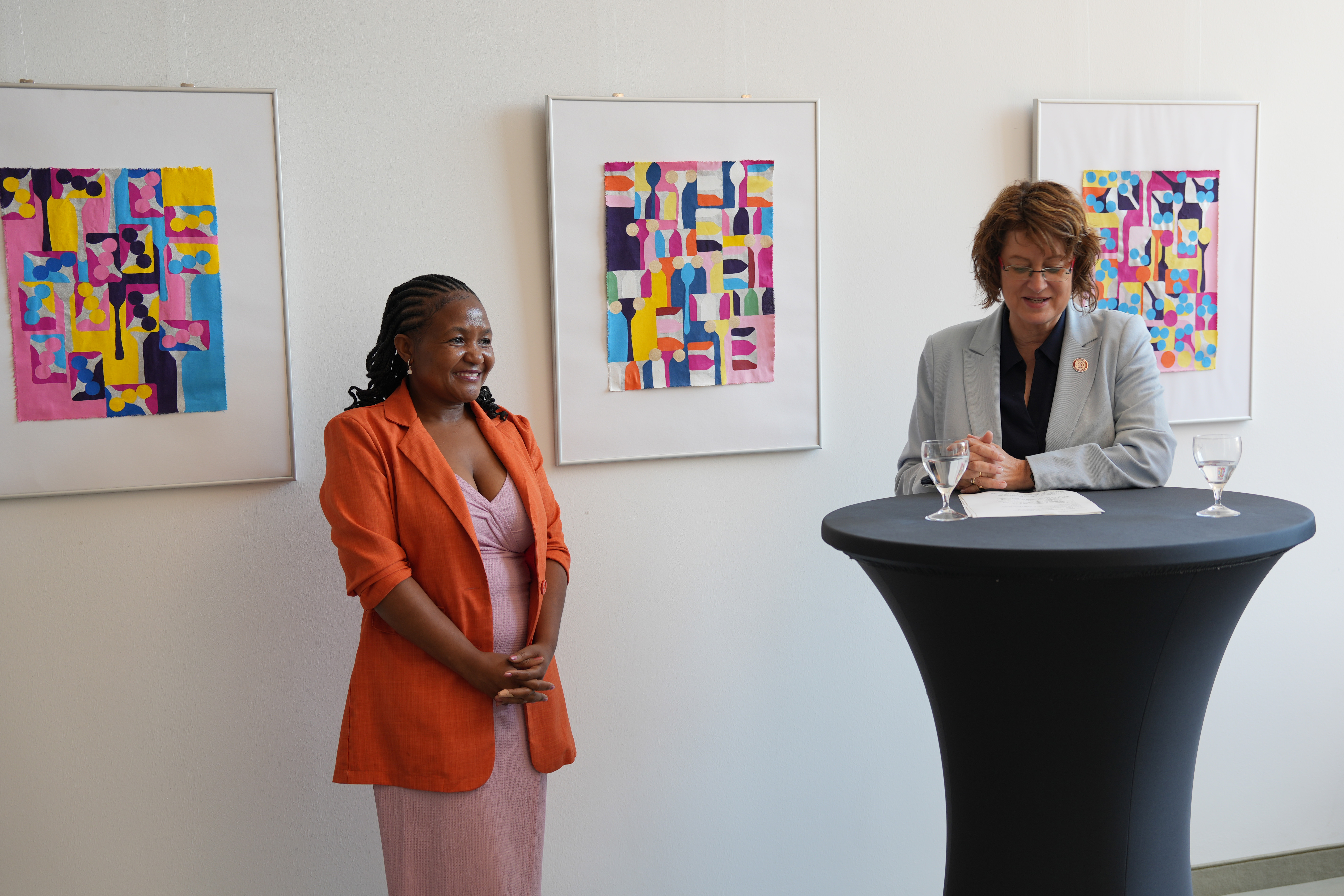 Die Künstlerin Maria Mbereshu neben Bürgerschaftspräsidentin Antje Grotheer bei der Ausstellungseröffnung.