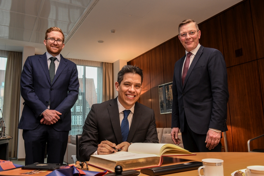 Begleitet wurde Quiroga von Constantin Conrad, Sohn des Honorarkonsuls für Mexiko. Der Auftakt des rund einstündigen Gesprächs nach dem Eintrag ins Gästebuch drehte sich um die politische Situation in Nordamerika. Der Regierungswechsel in den USA habe auf dem wirtschaftlichen Sektor wenig Veränderung gebracht, so Quiroga. Die von der Trump-Administration verstärkt eingesetzten Zölle im internationalen Handel seien nicht gegen Mexiko gerichtet gewesen. Die Flüchtlingssituation bedürfe hingegen größerer Aufmerksamkeit: Sein Land sei bemüht, den aus Mittelamerika einwandernden Flüchtlingen eine Perspektive in Mexiko zu bieten. Auch sei man bemüht, durch Investitionen in den Ursprungsländern die Flüchtlingsbewegungen zu verringern.