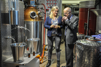 Besuch in der Gläsernen Manufaktur in der Überseestadt: hier werden die „Piekfeinen Brände“ von Birgitta Schule van Loon hergestellt. „Es ist mutig von Ihnen gewesen, sich in diesem, von Männern dominierten Bereich, selbstständig zu machen“, sagt Bürgerschaftspräsident Christian Weber, der sich vor Ort vom Erfolgsrezept der Schnaps-Brennerei überzeugt.