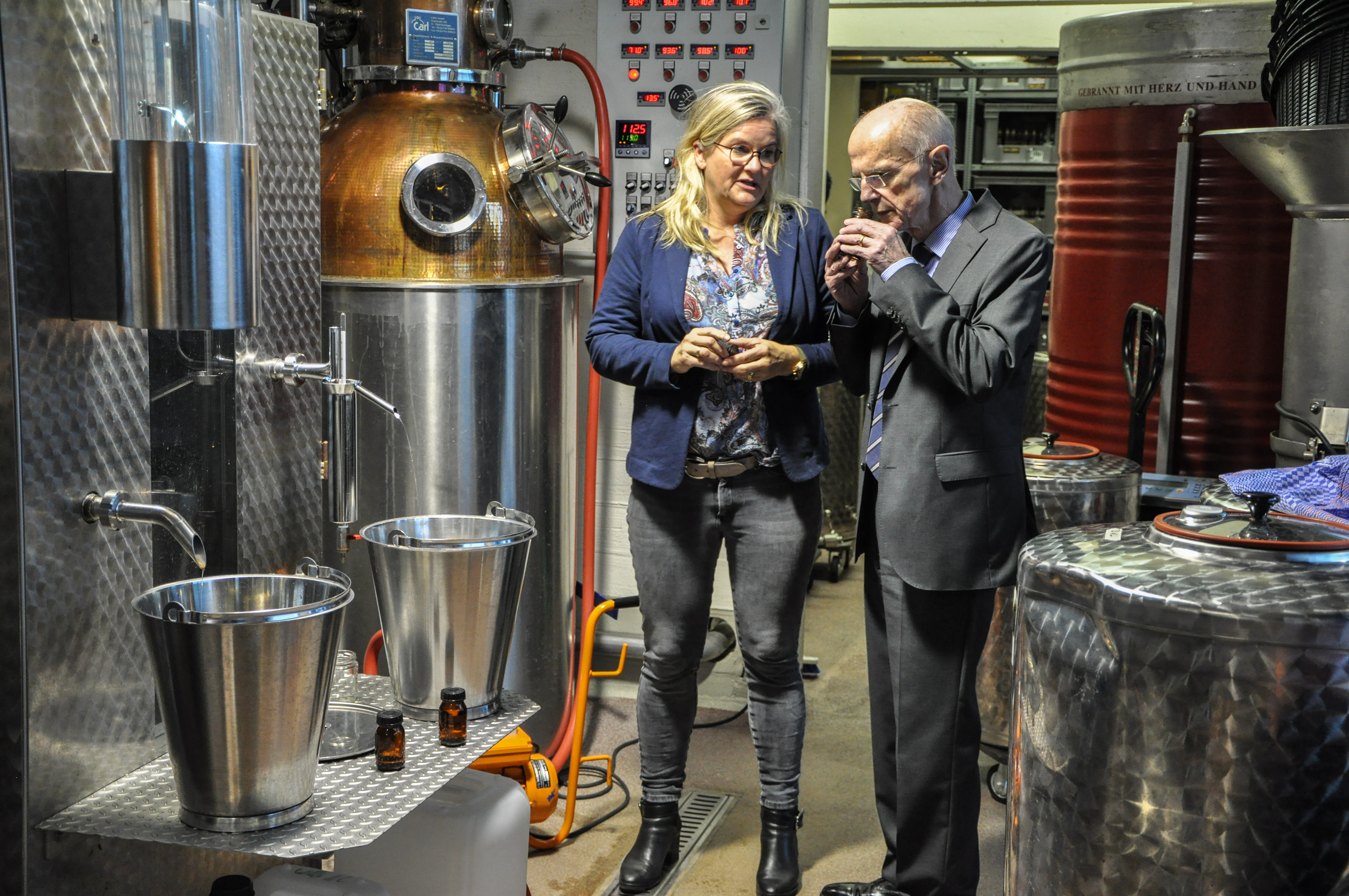 Bei einem Rundgang durch das Geschäft erfährt Christian Weber viel über unterschiedliche Brennverfahren und zeigt sich begeistert von den vielfältigen Kreationen von „Piekfeine Brände“. Da gibt es zum Beispiel die „Güter der Hansestädte“ - ein mit Tee und Kaffee verfeinerter Gin, der sich besonders gut verkauft.