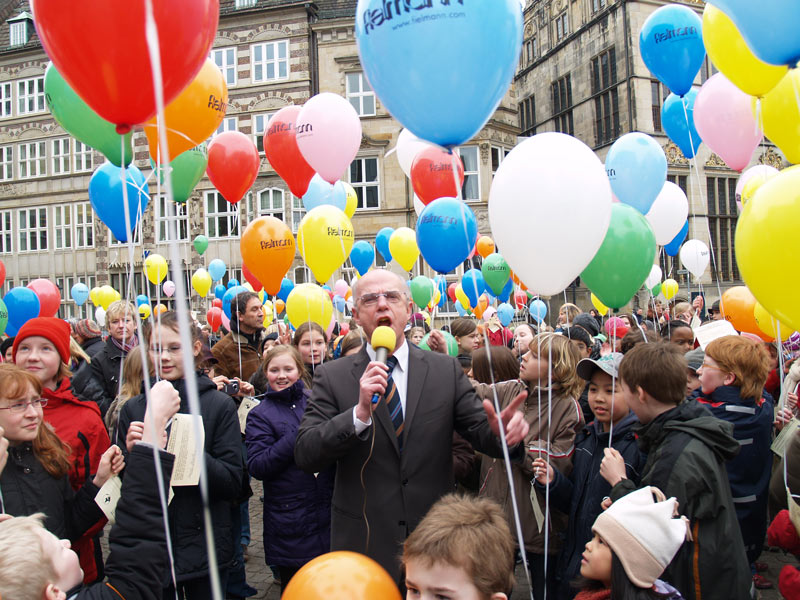 Es ist gute Tradition, dass Schülerinnen und Schüler der St.-Johannis-Grundschule und der 5. Klassen mit dem Präsidenten der Bremischen Bürgerschaft, Christian Weber, auf dem Marktplatz Luftballons in die Luft steigen lassen. Heute (12. März) war es wieder soweit. Viele bunte Farbtupfer zogen aus, um auf die Burkina-Faso-Woche aufmerksam zu machen. Unter dem Motto „Kein Teil der Welt kann ohne den anderen leben“ endet die Solidaritätsaktion am Wochenende mit einem großen Flohmarkt von 9.30 bis 15.30 Uhr (Sonnabend) in der Dechanatstraße und einem Benefizkonzert (Sonntag). Seit 1973 konnte die katholische St.-Johannis-Schule über 865.000 Euro für Projekte in Burkina-Faso spenden. Christian Weber: „Die engagierte Verbundenheit mit einem der ärmsten Länder der Welt ist mehr als Entwicklungshilfe, sie ist Freundschaftsdienst einer Jugend, die bewundernswert viel in Menschlichkeit und Gerechtigkeit investiert.“