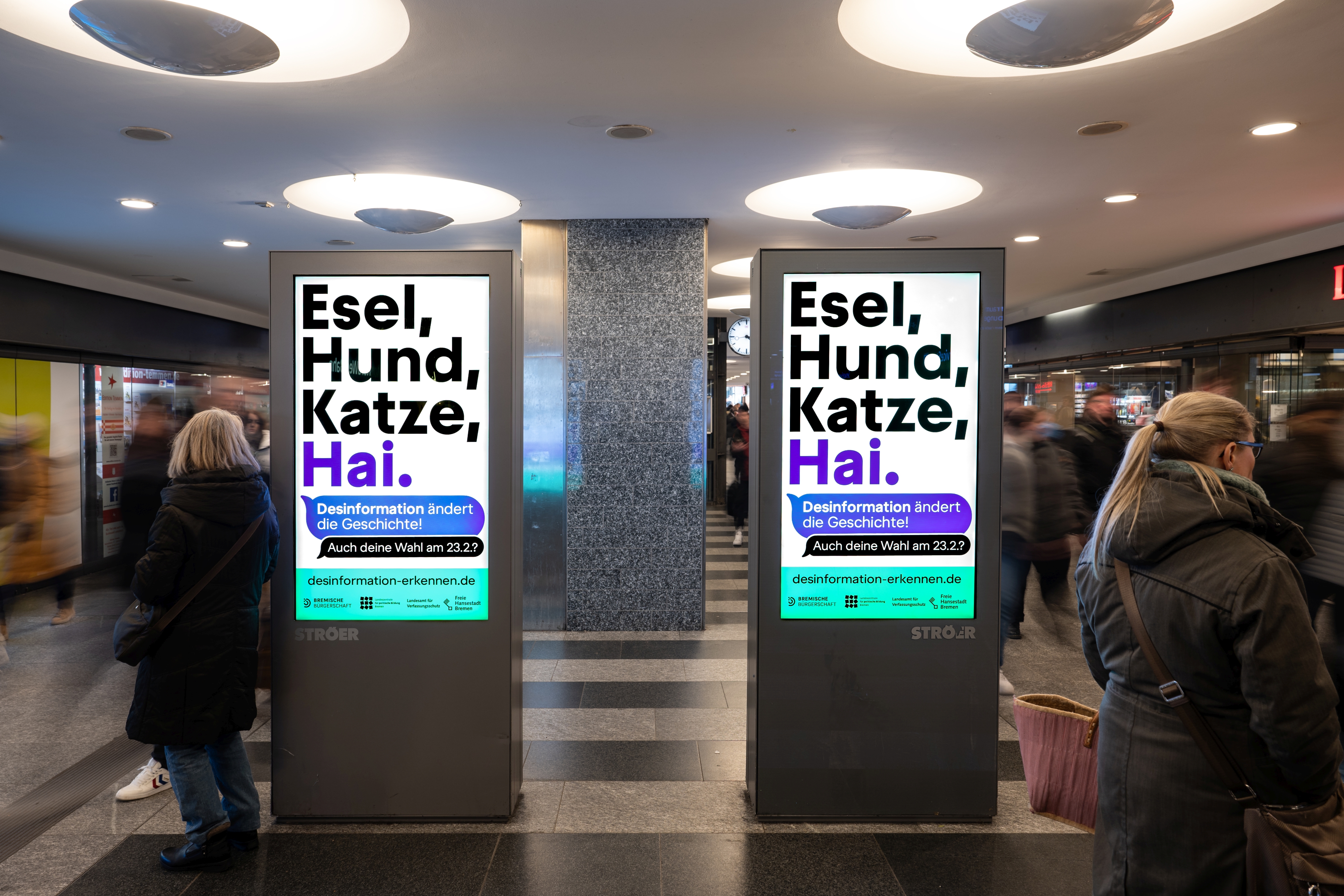 Bürgerschaftspräsidentin Antje Grotheer hat heute (10. Februar) gemeinsam mit dem Leiter des Bremer Landesamtes für Verfassungsschutz, Thorge Koehler, und dem Leiter der Landeszentrale für politische Bildung Bremen, Dr. Thomas Köcher, eine Außenwerbekampagne vorgestellt, die in den kommenden Wochen bis zur Bundestagswahl auf die Gefahren gezielter – häufig aus dem Ausland gesteuerter – Desinformationskampagnen hinweisen soll. Das Medienhaus Ströer unterstützt die Kampagne und spielt das Motiv in digitaler Form auf 57 Screens überall in Bremen und Bremerhaven aus – auf großen Anlagen wie zum Beispiel am Rembertiring oder Am Dobben, ebenso wie auf kleineren Bildschirmen, inklusive derer im Bahnhof und in der Waterfront.