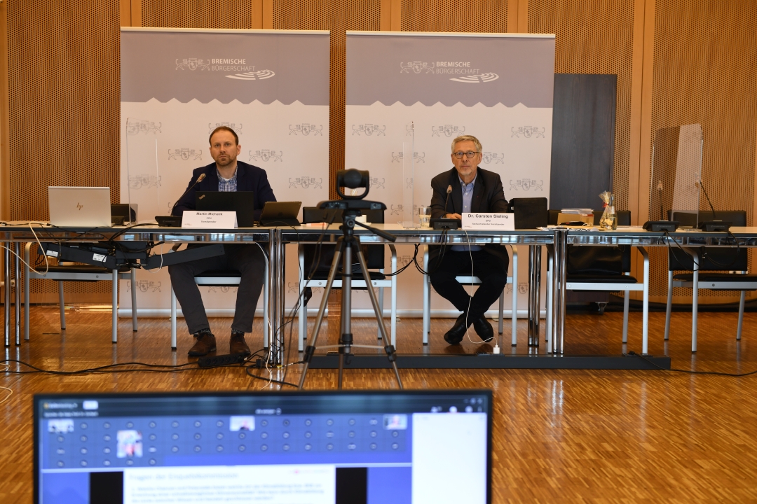 Der Kommissionsvorsitzende Martin Michalik und sein Stellvertreter Dr. Carsten Sieling leiteten die Sitzung aus den Räumen der Bürgerschaft, die übrigen Mitglieder, die Sachverständigen und die Gäste der heutigen Sitzung schalteten sich aus ihren Büros oder den eigenen vier Wänden dazu.