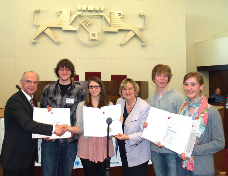 In ausgezeichneter Redelaune präsentierten sich heute (15. April) Jugendliche im Plenarsaal der Bremischen Bürgerschaft. Vier Schülerinnen und Schüler qualifizierten sich beim Landesfinale „Jugend debattiert“ für das Bundesfinale in Berlin: Maren Steinert und Lukas Kleen für die Jahrgangsstufen 11 bis 13 sowie Frieda Merrath und Max Nickel für die Klassen 8 bis 10. Die beiden Letztgenannten überzeugten im Schlagabtausch zur Frage „Sollen auf deutschen Flughäfen Sicherheitskontrollen mit Körperscannern durchgeführt werden?“ Maren Steinert und Lukas Kleen hinterließen beim Thema „Sollen in Bremen keine weiteren Privatschulen zugelassen werden?“ den besten Eindruck. Rund 4000 Schüler haben sich im laufenden Schuljahr am Landeswettbewerb „Jugend debattiert“ in Bremen beteiligt. Es handelt sich um ein Projekt der sprachlichen und politischen Bildung. Es wird gefördert von der Gemeinnützigen Hertie-Stiftung gemeinsam mit der Robert Bosch Stiftung, der Stiftung Mercator und der Heinz Nixdorf Stiftung in Kooperation mit der Kultusministerkonferenz und den Kultusministerien der Länder. Zu den Juroren zählten Bürgerschaftspräsident Christian Weber und die Bremer Senatorin für Bildung und Wissenschaft, Renate Jürgens-Pieper. Die Sieger im Wettbewerb besuchen das Alte Gymnasium in Bremen und das Gymnasium an der Hamburger Straße.