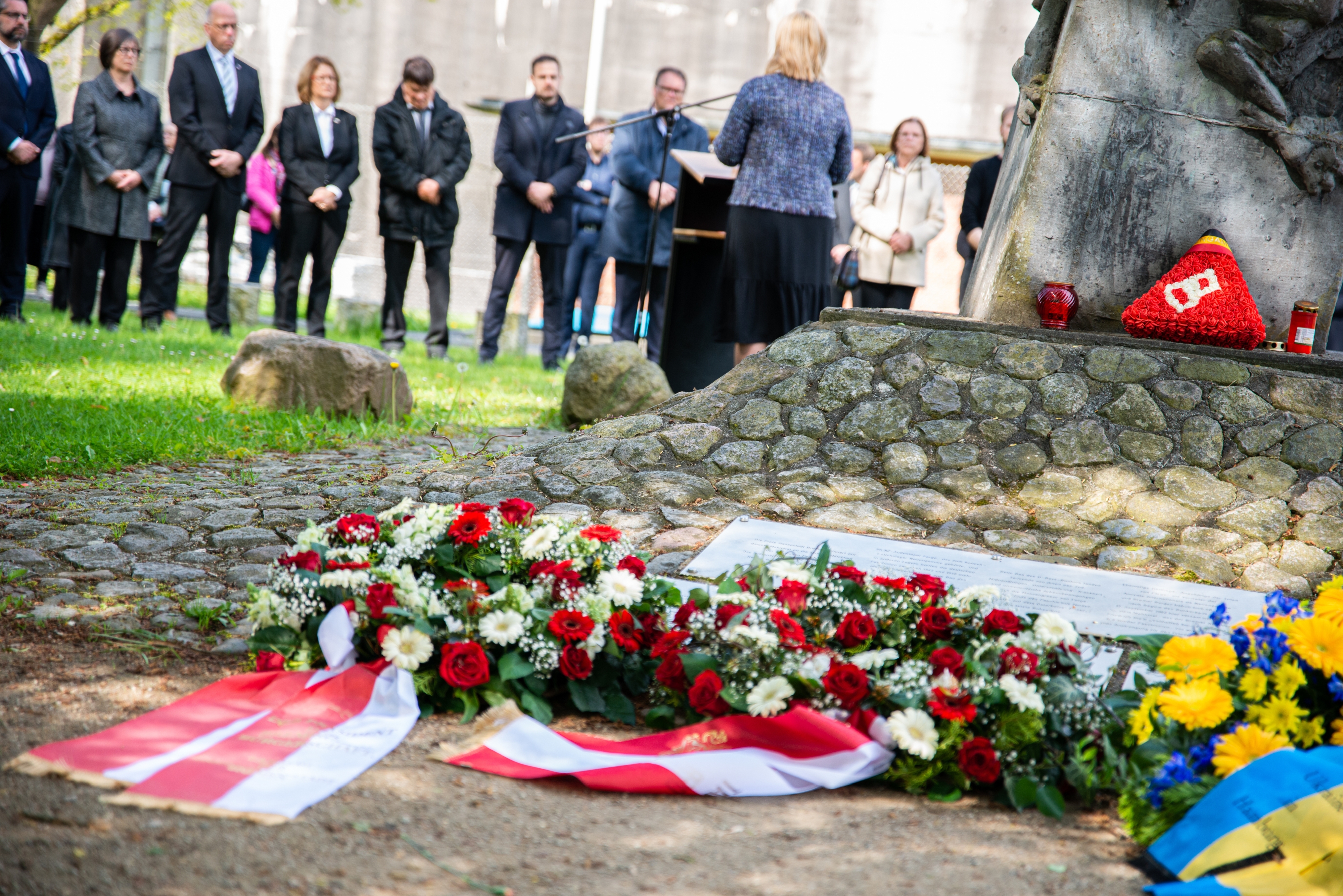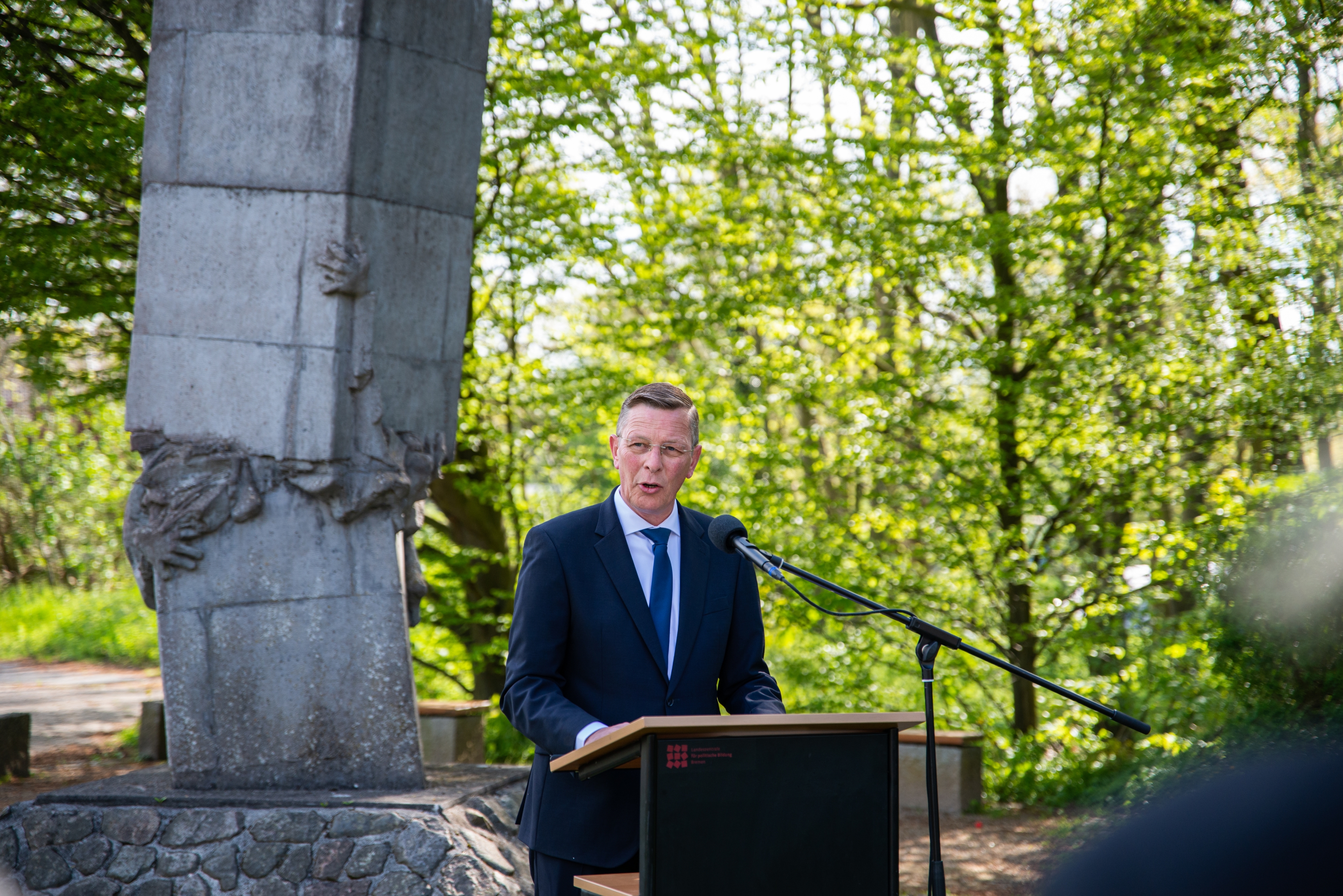 Für die Bremische Bürgerschaft, den Senat und das ukrainische Generalkonsulat legten Imhoff, Schaefer und Tybinka Kränze beim Mahnmal „Vernichtung durch Arbeit“ nieder. Es erinnert seit 1983 an das Schicksal von tausenden Zwangsarbeitern. „Der heutige 8. Mai ist ein Tag des Gedenkens und des Erinnerns, an Leid, Tod und Trauer – gestern, heute und morgen", machte Imhoff deutlich. In Gedenken an die Opfer hielten sie gemeinsam mit den Gästen für eine Schweigeminute inne.