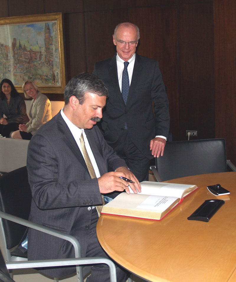 Der Botschafter von Mexiko in Deutschland, Francisco N. González Díaz, wurde heute (1. September) von Bürgerschaftspräsident Christian Weber zum Antrittsbesuch empfangen. Der Diplomat trug sich zunächst ins Gästebuch des Parlaments ein, um sich dann mit Christian Weber insbesondere über kulturelle und wirtschaftliche Zusammenarbeit auszutauschen. Die Beziehung zwischen Mexiko und der Freien Hansestadt Bremen gelten als historisch. Kaufleute aus Hamburg und Bremen gehörten zu den ersten Deutschen, die nach den napoleonischen Kriegen nach Lateinamerika gingen und Anfang des 19. Jahrhunderts Kontakte mit dem gerade entstehenden Staat knüpften.
