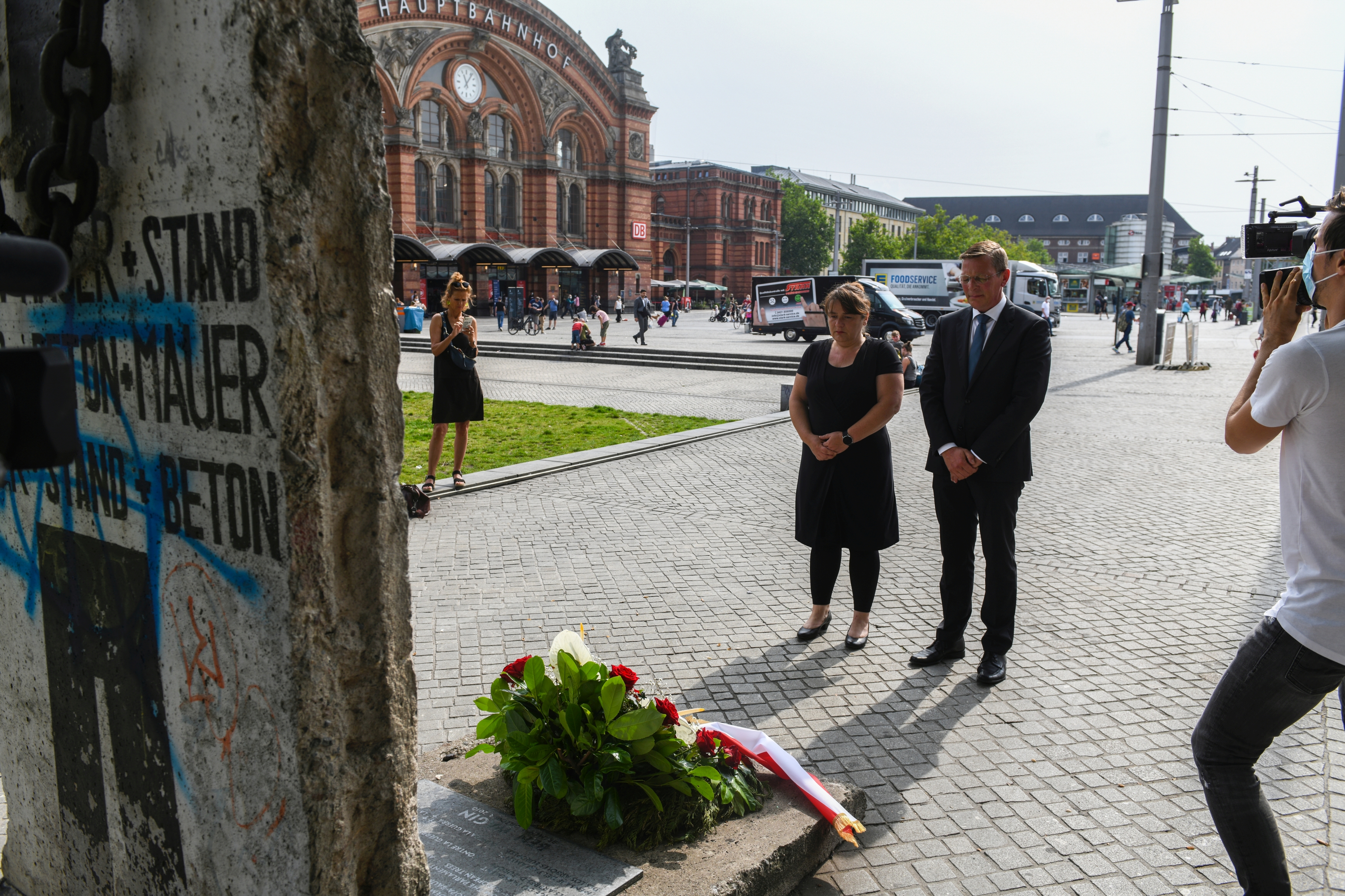 Im Gedenken an die Opfer der Mauer und der deutschen Teilung hat Bürgerschaftspräsident Frank Imhoff heute einen Kranz am Platz der Deutschen Einheit niedergelegt. Auf dem Areal zwischen Hauptbahnhof und Übersee-Museum steht seit 2010 ein Stück der Berliner Mauer, das der kürzlich verstorbene Künstler Ben Wagin gestaltet hatte.
