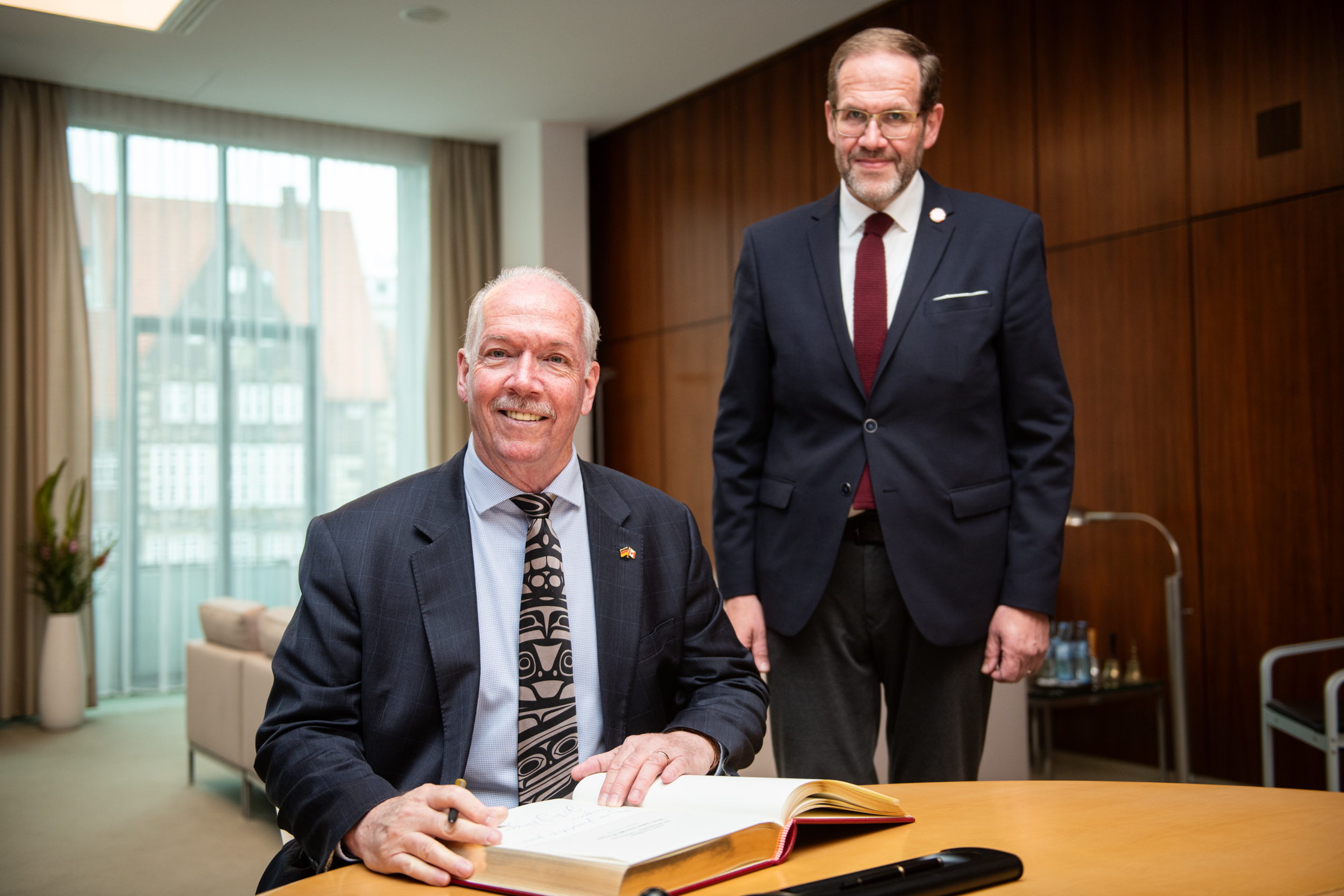 Claas Rohmeyer, Vorstandsmitglied der Bremischen Bürgerschaft, konnte heute (3.6.) den Botschafter Kanadas, John Horgan, zum Antrittsbesuch im Parlamentsgebäude am Marktplatz begrüßen. Horgan, der sein Heimatland seit Ende des vergangenen Jahres in Berlin repräsentiert, war vor seiner Ernennung zum Botschafter unter anderem Premier der kanadischen Provinz British Columbia. Begleitet wurde er bei seinem Besuch von der stellvertretenden Leiterin der Botschaft, Evelyne Coulombe.