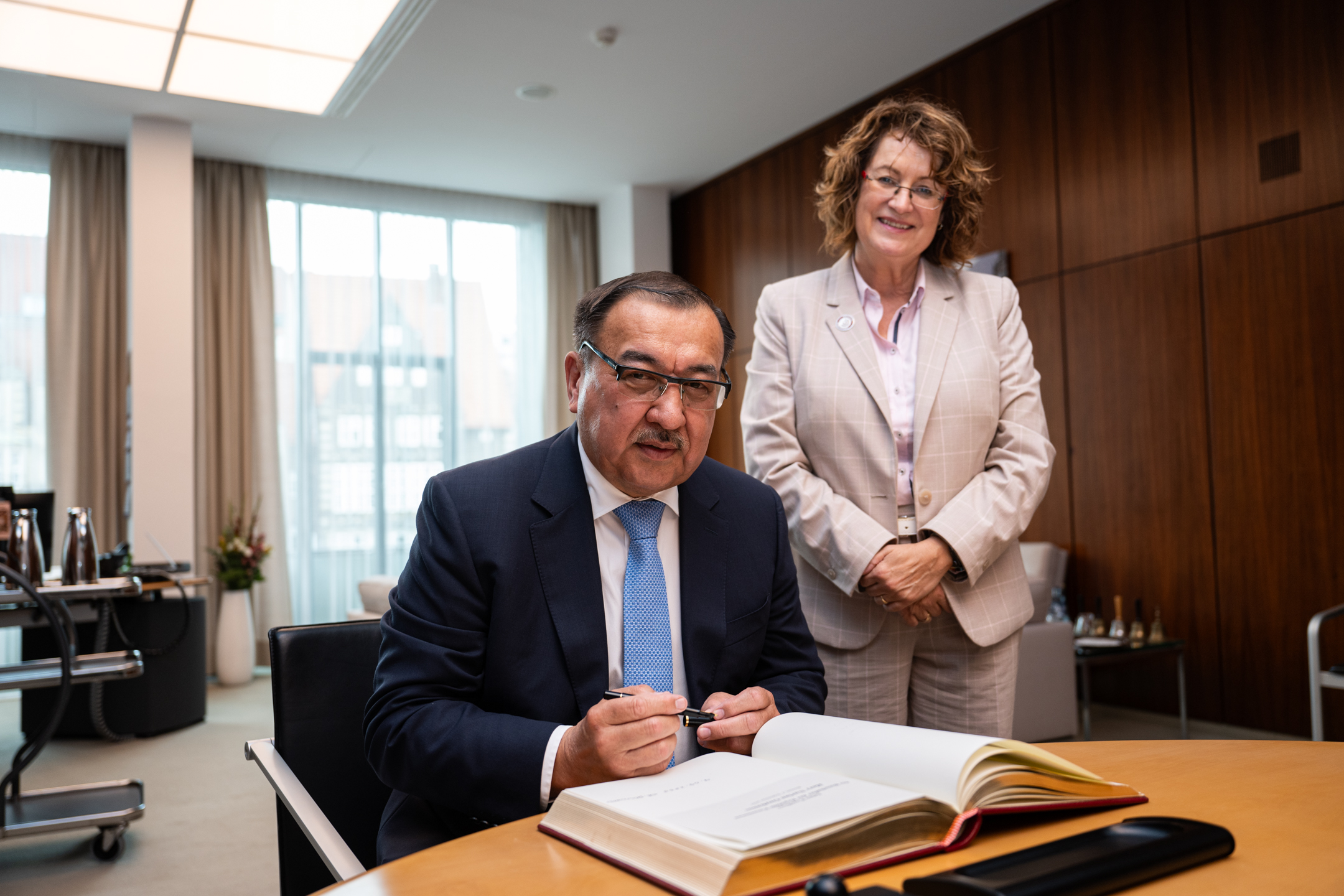 Bürgerschaftspräsidentin Antje Grotheer konnte heute den Botschafter der Republik Kasachstan, Dr. Nurlan Ozhanov, zum Antrittsbesuch im Parlamentsgebäude am Marktplatz begrüßen. Ozhanov, der seit 2022 sein Heimatland in Berlin repräsentiert, war bereits von 2008 bis 2014 in dieser Position tätig. Bis zu seiner erneuten Ernennung war er unter anderem Berater des kasaschischen Präsidenten Nursultan Nasarbajew. Begleitet wurde er bei seinem Besuch von Generalkonsul Denis Rogov.