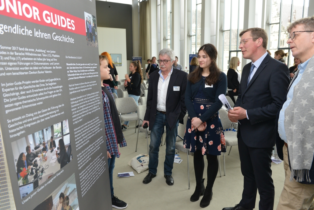 Beim anschließenden Austausch untereinander gab es für alle die Gelegenheit, die einzelnen Projekte genauer kennenzulernen: Bei "Junior Guides – Jugendliche lehren Geschichte" werden Kinder und Jugendliche zu Experten für die Geschichte eines Ortes. Die Junior Guides entwickeln selbst ihre Fragen an den Ort und setzen eigene thematische Schwerpunkte. Talon (12), Madeline (13) und Finja (17) aus den Oberschulen am Barkhof und an der Lerchenstraße beschäftigten sich in ihrem Projekt mit dem Denkort Bunker Valentin und arbeiteten ein halbes Jahr lang auf ihre ersten eigenen Führungen im Dokumentationslernort hin. Unterstützt wurden die drei Schüler von Fachleuten des Bunker Valentins.
