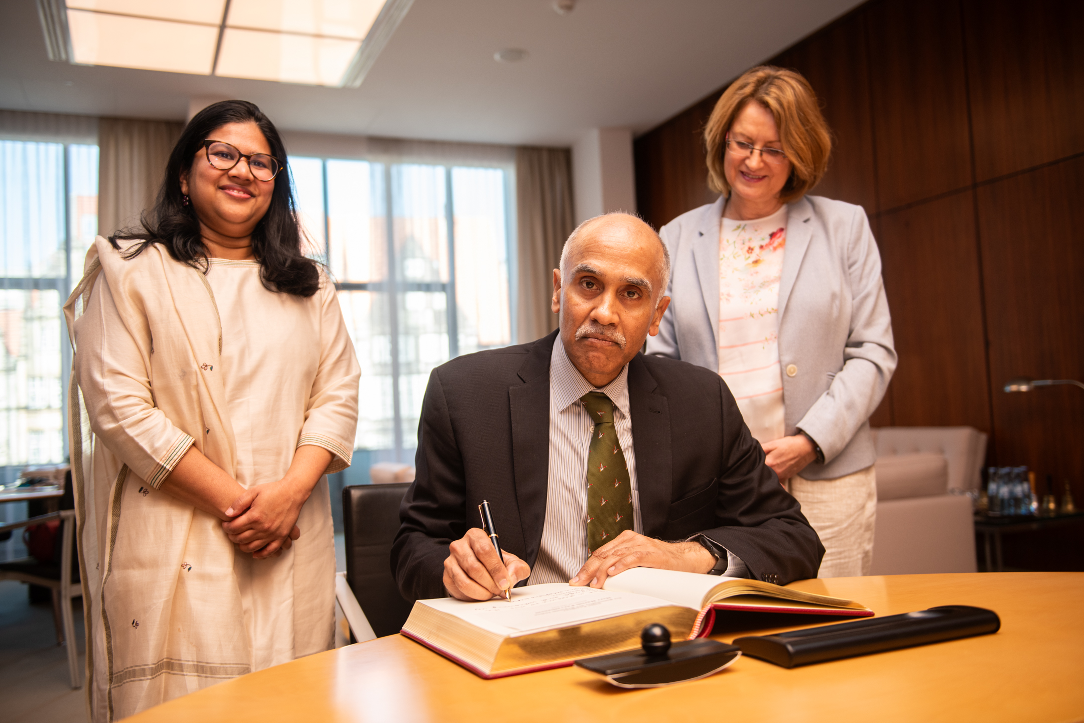 Bürgerschaftspräsidentin Antje Grotheer konnte heute den Botschafter der Republik Indien, Harish Parvathaneni, und Generalkonsulin Soumya Gupta zum Antrittsbesuch im Parlamentsgebäude am Marktplatz begrüßen. Parvathaneni, der sein Heimatland seit Ende 2021 in Berlin repräsentiert, war zuvor unter anderem in diplomatischen Positionen in Ägypten, den USA und Vietnam tätig.