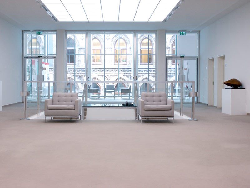 Auf der gleichen Ebene erstreckt sich über die gesamte Breite des Gebäudes der Festsaal. Durch dessen Glasfront wirkt die Marktplatzarchitektur unmittelbar in diesen lichtdurchfluteten Raum hinein.