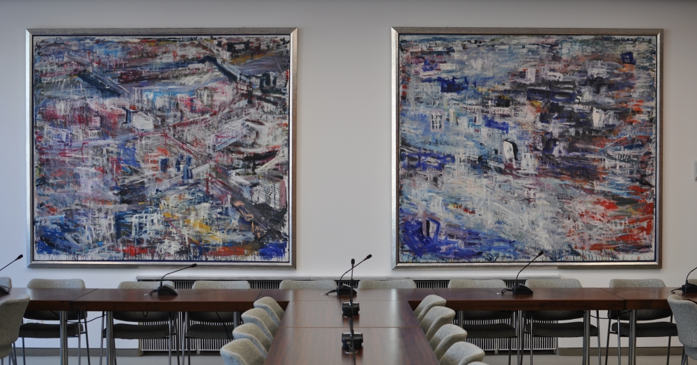 Die beiden unbetitelten Gemälde des Künstlers Thomas Hartmann stammen aus den Jahren 1981-1983 und befinden sich seit 1983 als Leihgabe der Städtischen Galerie im Haus der Bürgerschaft. Seit längerem ist ihnen ein Platz im großen Sitzungsraum des Hauses gewidmet. Eines zeigt ein Hafen-Motiv, das andere eine Stadt.