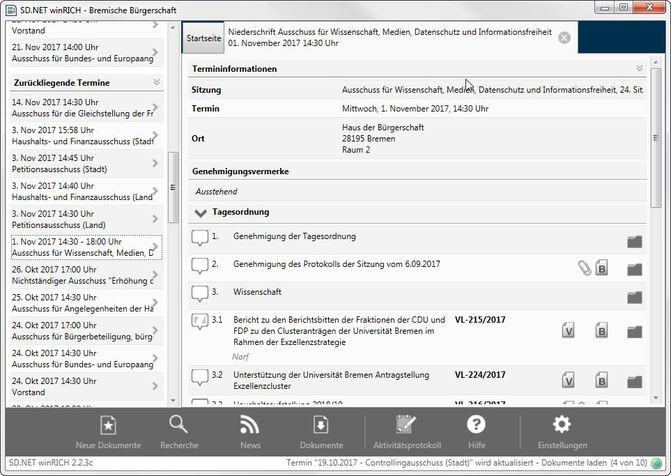 Abgeordneten, Fraktionsmitarbeiter/-innen und ständigen Gästen der Ausschüsse steht auf Anfrage auch das kostenlose Programm winRICH für Computer oder Notebooks mit Microsoft Windows® zur Verfügung. winRICH verfügt über einen ähnlichen Funktionsumfang wie die Apps für Android™ und iOS*. Bitte wenden Sie sich dazu per E-Mail an ausschussgeschaeftsstelle@buergerschaft.bremen.de.