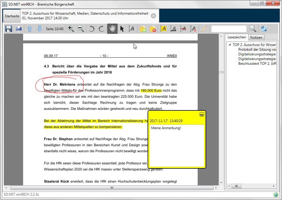 Ja, in den Apps für Abgeordnete und Gremienmitglieder (siehe Box rechts auf dieser Seite) ist dies möglich. Wie in der Anleitung im Abschnitt "Geteilte Notizen" ab S. 19 beschrieben, tippen Sie in der Dokumentansicht auf den Button "Geteilte Notizen", um eigene Notizen einzugeben und bereits gespeicherte Notizen anderer Fraktionsmitglieder einzusehen.