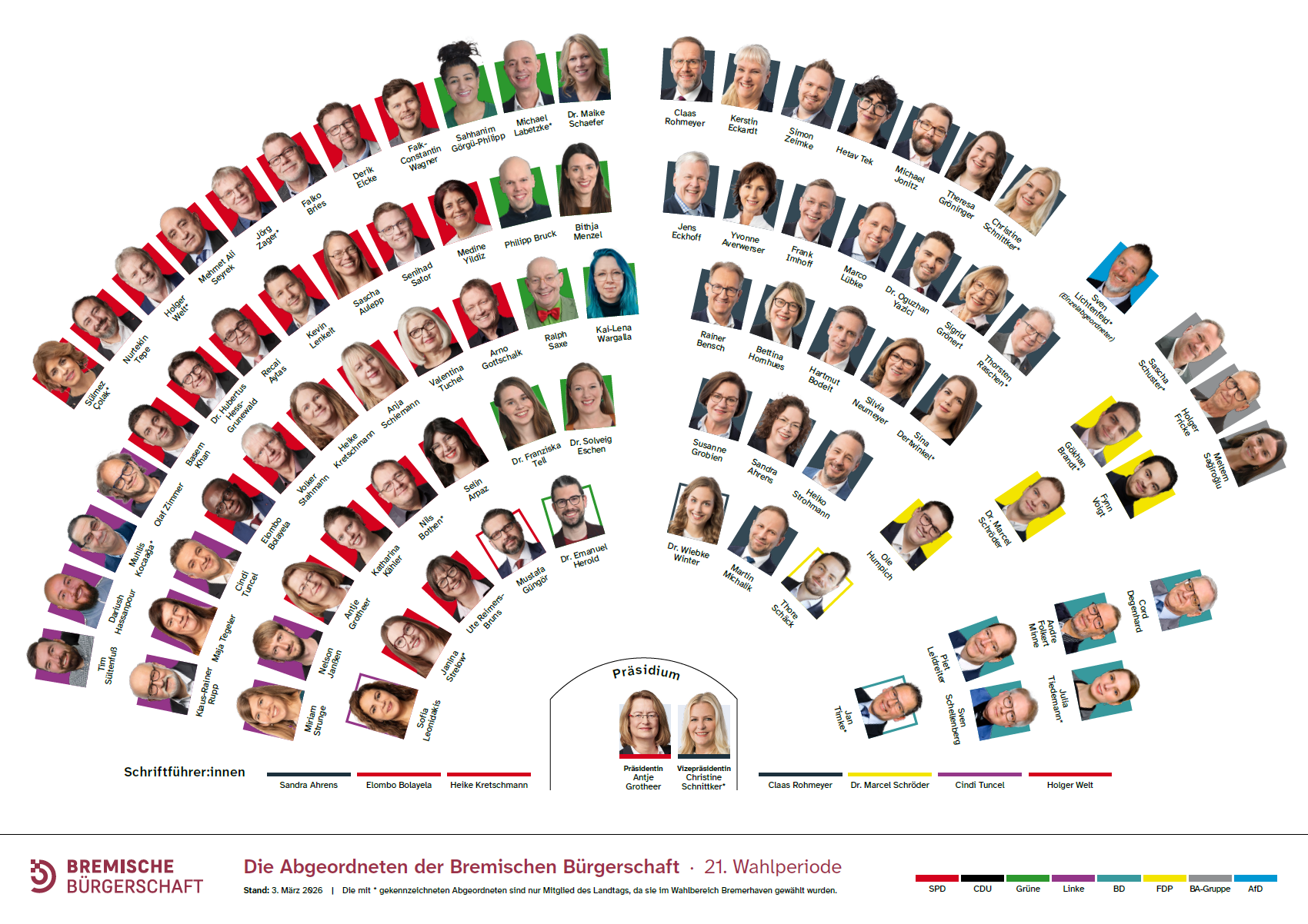 Sitzplan der 87 Abgeordneten der Bremischen Bürgerschaft